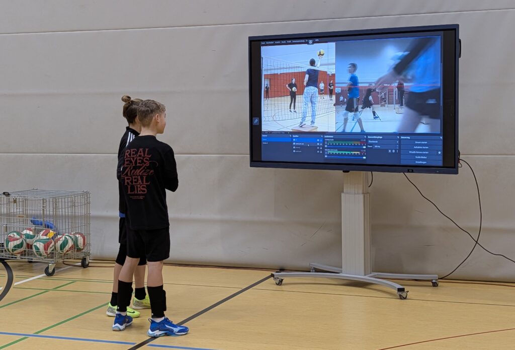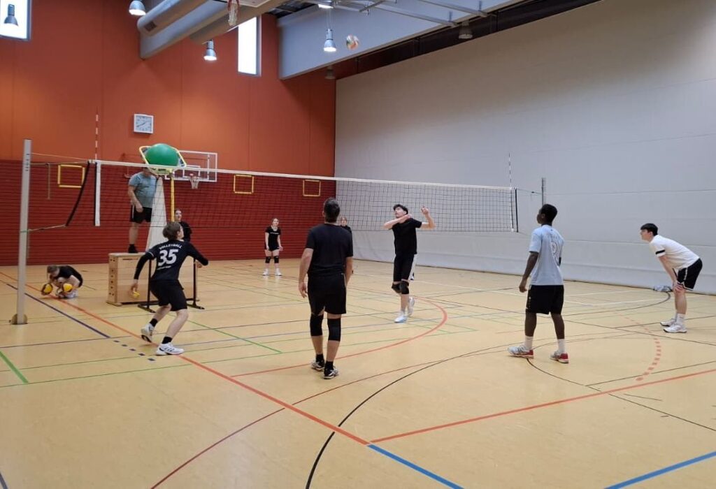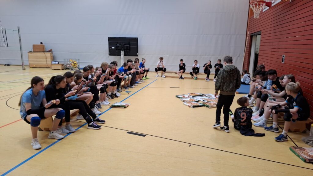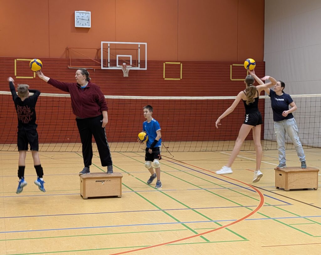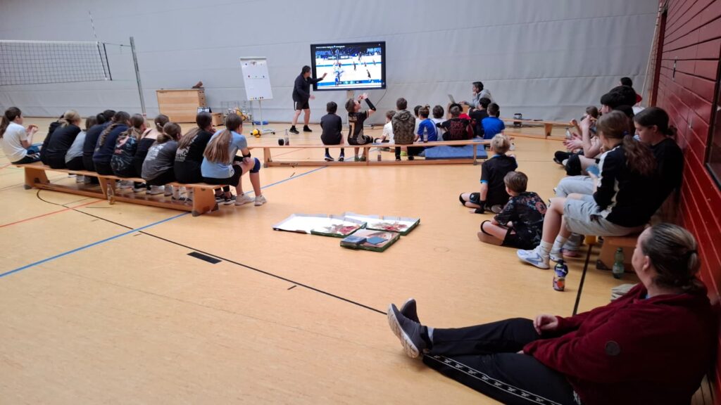 Über 40 Jugend-Spieler/innen, bunt gemischt von der U12 bis zur U18, waren ab 8 Uhr dabei, ihre Volleyball Skills zu schärfen und ein paar neue Spielzeuge auszuprobieren, z.B. die zeitversetzte Videoanalyse, den Spike- oder den Zustell-Trainer. Ein bisschen Theorie muss auch sein, wenn z.B. ein paar aus der U15 hoch rutschen und dann zu sechst auf dem Platz zurecht kommen müssen.